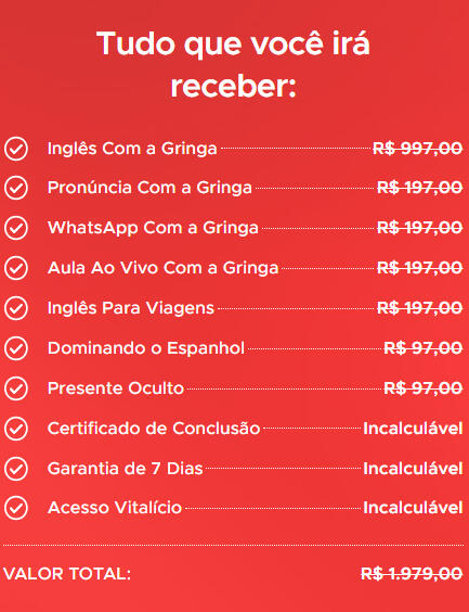 O curso “Inglês com a Gringa” é um curso completo, dividido em 29 módulos do básico ao avançado, atendendo assim todos os níveis, desde o mais básico até a fluência. No início do curso, você poderá entrar para um grupo no WhatsApp e ter o suporte da própria professora, ou seja, uma nativa 24 horas a sua disposição.