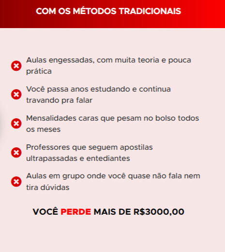 Até quando você vai adiar esse sonho por achar que “não nasceu pra isso”?Vendo outras pessoas conseguindo emprego melhor, viajando, estudando fora… e você aí, travado até pra responder um “How are you?”?Já passou da hora de parar de se sentir inseguro(a) e frustrado(a) por não conseguir falar inglês, mesmo tendo tentado vários cursos, aplicativos ou videozinhos do YouTube.Chegou a hora de aprender com quem entende o que você precisa — de forma simples, leve e com foco total em conversação.Essa é a sua oportunidade de virar o jogo e destravar o inglês de uma vez por todas.E eu te desafio a encontrar outro curso com tanto resultado real e por um preço tão justo quanto esse.
