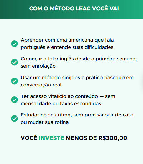 O melhor método que eu conheço é chamado LEAC. Que se baseia em 4 pilares para levar a pessoa do zero até a fluência. Ele foi desenvolvido baseado na maneira como os nativos aprendem o idioma. Que é aprender com a Leitura, Escrita, Audição e Conversação. Eu apliquei esse exato método para me tornar fluente em Português!Além do curso onde eu ensino todo o meu método, você terá a oportunidade de ter uma nativa para te ajudar a comunicar de maneira tão natural como os norte-americanos! Eu mesma vou te ajudar com todas as suas dúvidas. Seguiremos juntos a estrada que te leva a fluência.Com o meu curso você terá uma nativa a sua disposição, sem precisar gastar caro com viagens, intercâmbios ou professores particulares