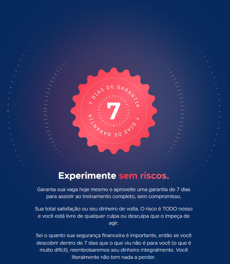 Claro! Como confiamos em nosso método, você poderá testar o curso por 7 dias! Se por algum motivo não gostar do curso, devolvemos 100% do valor investido.